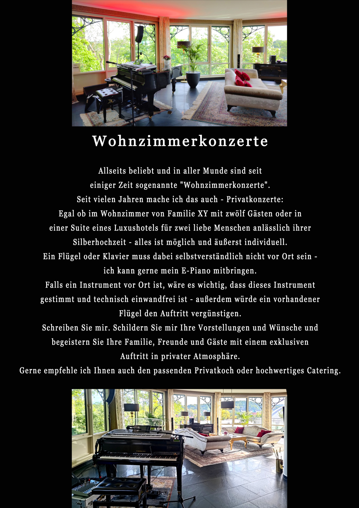 Privatkonzerte – egal ob im Wohnzimmer von Familie XY mit zwölf Gästen oder in einer Suite eines Luxushotels für zwei liebe Menschen anlässlich ihrer Silberhochzeit o.ä. – alles ist möglich und äußerst individuell.